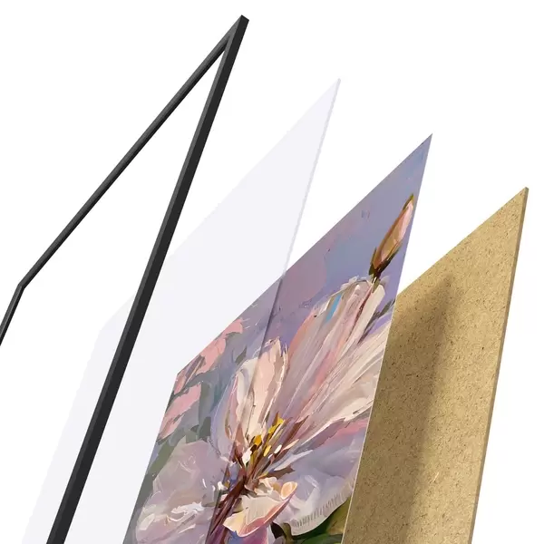 El póster consta de marco, plexiglás, imagen impresa y soporte de aglomerado. El póster puede colgarse inmediatamente en la pared gracias a los soportes de la parte posterior.