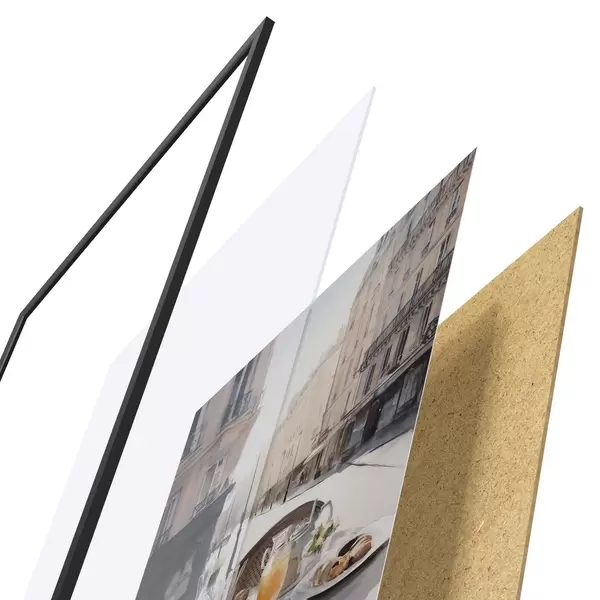 El póster consta de marco, plexiglás, imagen impresa y soporte de aglomerado. El póster puede colgarse inmediatamente en la pared gracias a los soportes de la parte posterior.