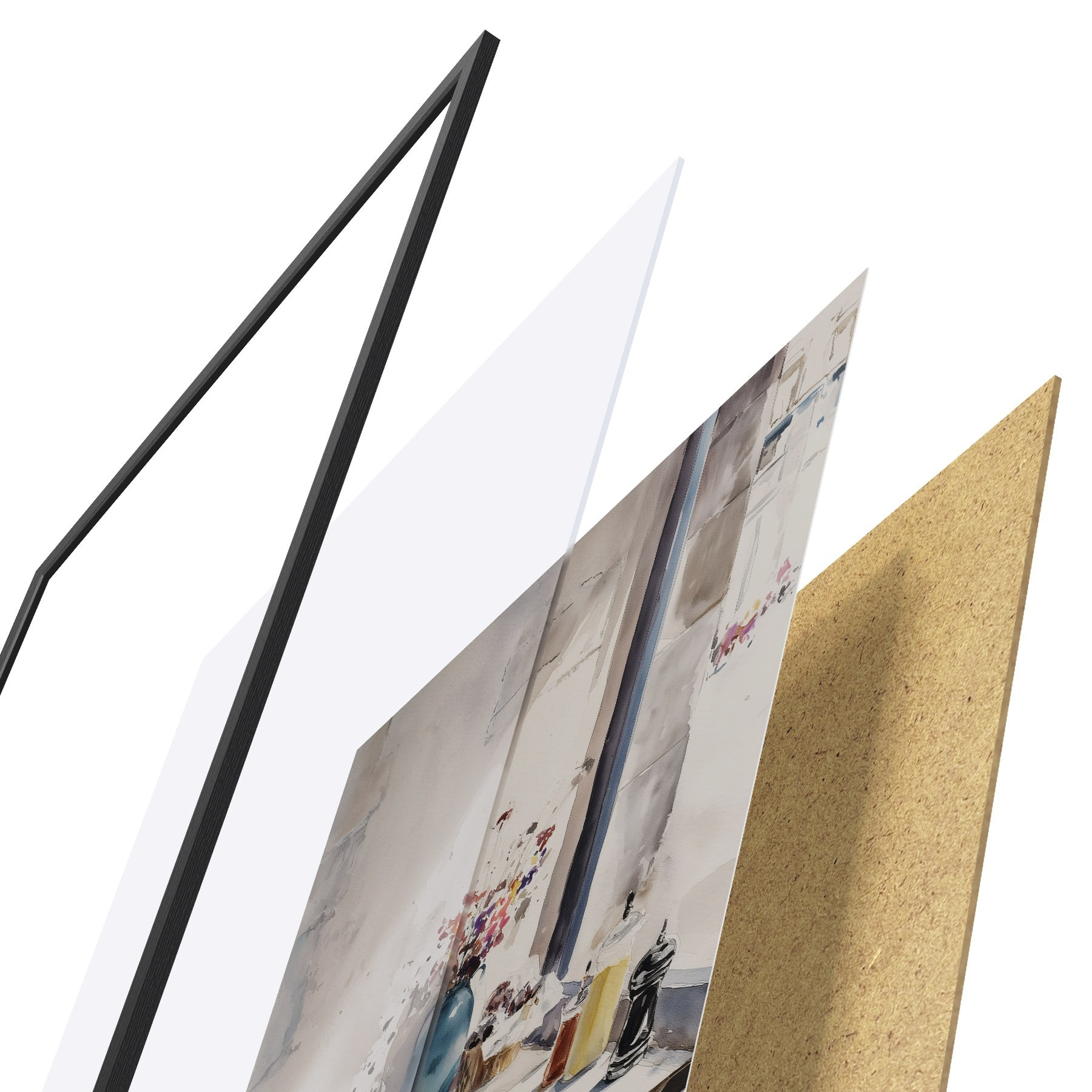 El póster consta de marco, plexiglás, imagen impresa y soporte de aglomerado. El póster puede colgarse inmediatamente en la pared gracias a los soportes de la parte posterior.