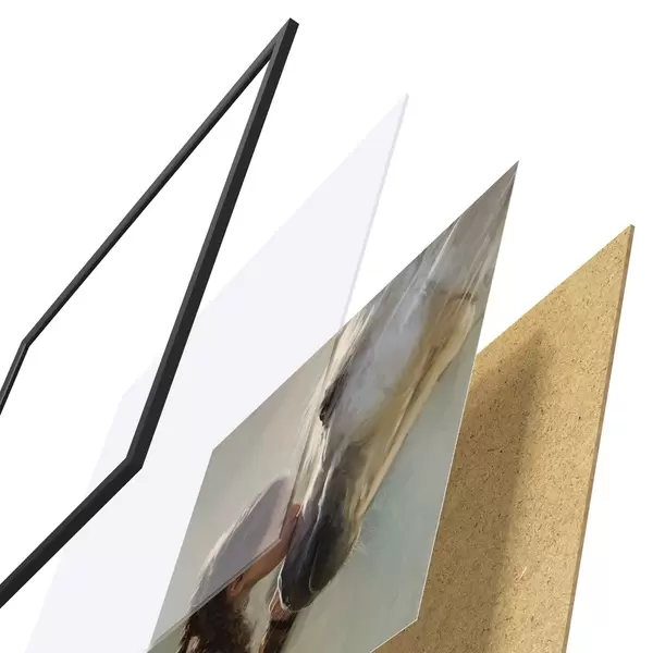 El póster consta de marco, plexiglás, imagen impresa y soporte de aglomerado. El póster puede colgarse inmediatamente en la pared gracias a los soportes de la parte posterior.