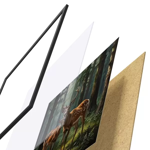 El póster consta de marco, plexiglás, imagen impresa y soporte de aglomerado. El póster puede colgarse inmediatamente en la pared gracias a los soportes de la parte posterior.