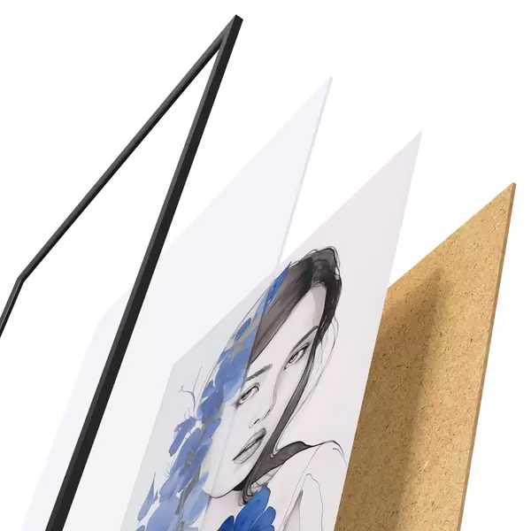 El póster consta de marco, plexiglás, imagen impresa y soporte de aglomerado. El póster puede colgarse inmediatamente en la pared gracias a los soportes de la parte posterior.