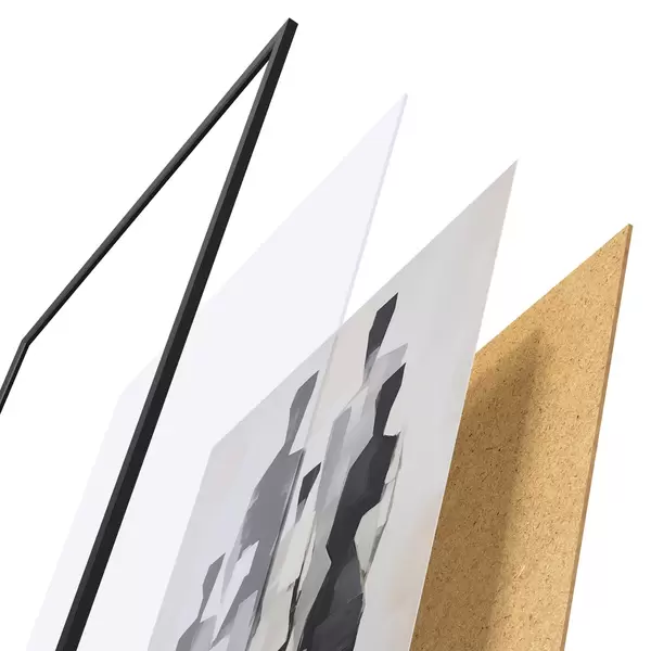 El póster consta de marco, plexiglás, imagen impresa y soporte de aglomerado. El póster puede colgarse inmediatamente en la pared gracias a los soportes de la parte posterior.