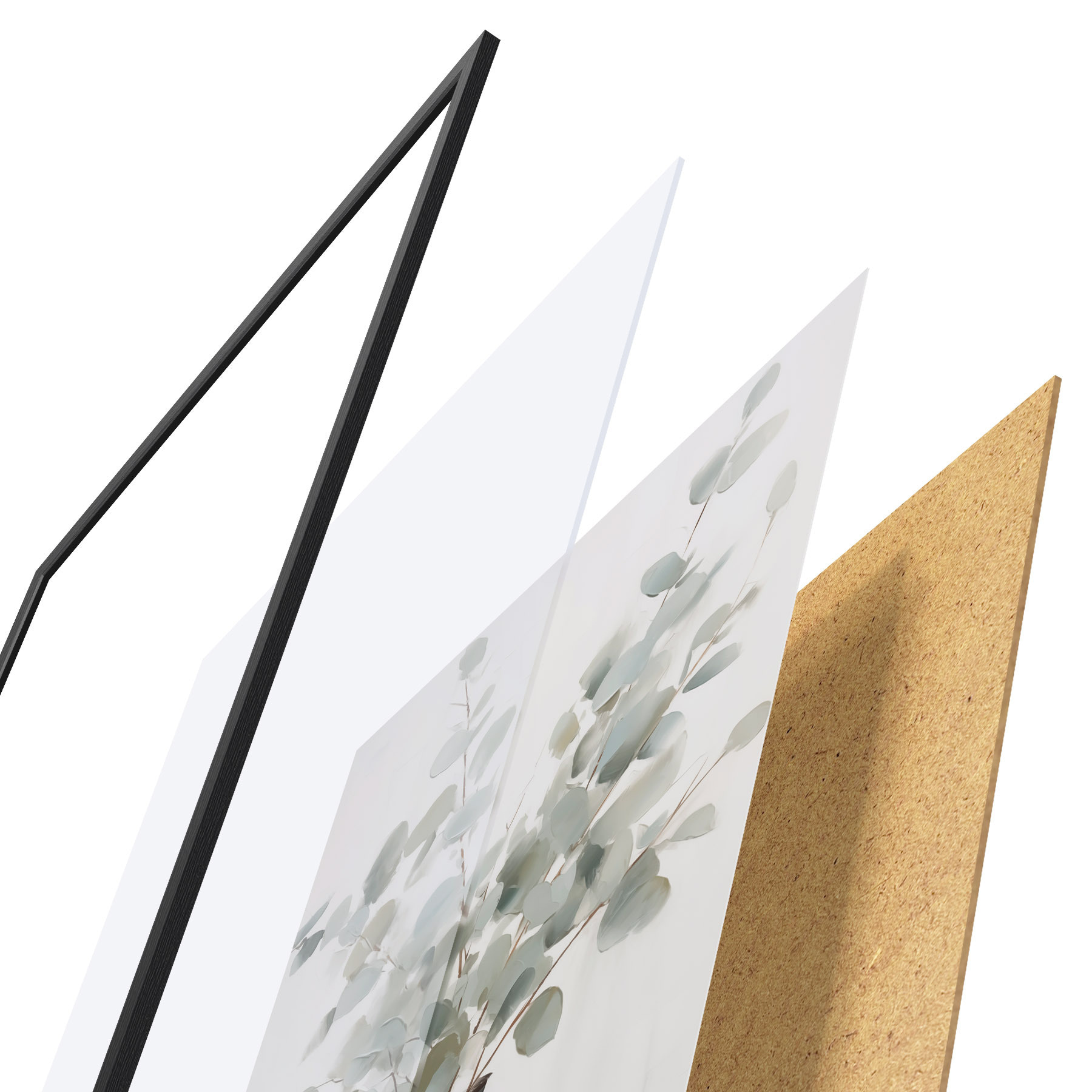 El póster consta de marco, plexiglás, imagen impresa y soporte de aglomerado. El póster puede colgarse inmediatamente en la pared gracias a los soportes de la parte posterior.