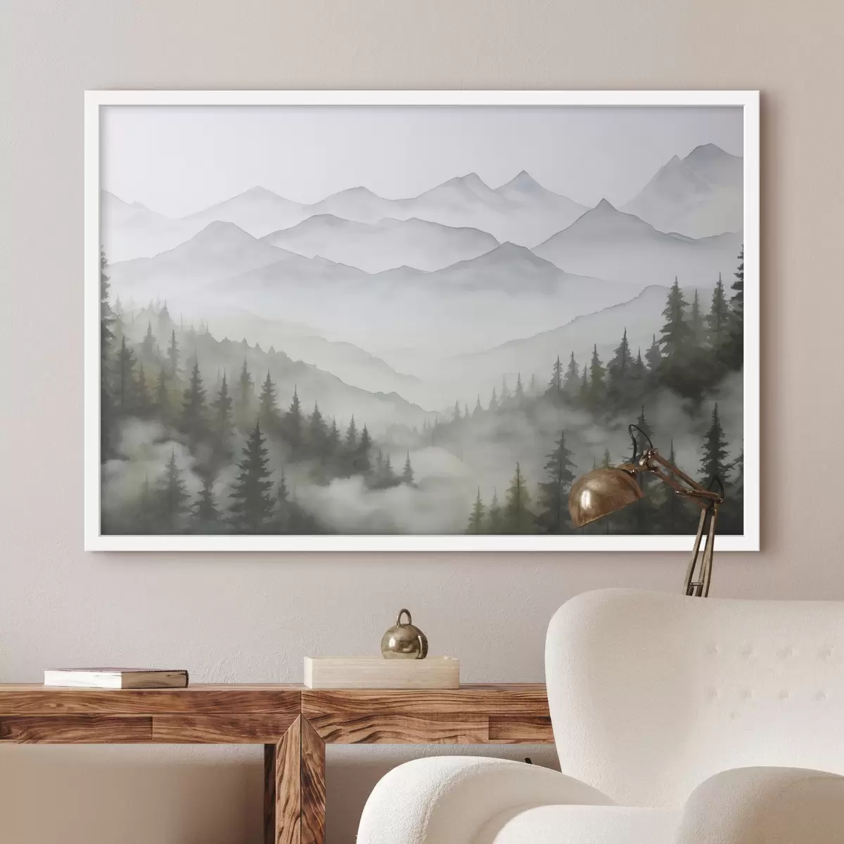 Poster Bosque en la niebla frente a las montañas Nr f45774