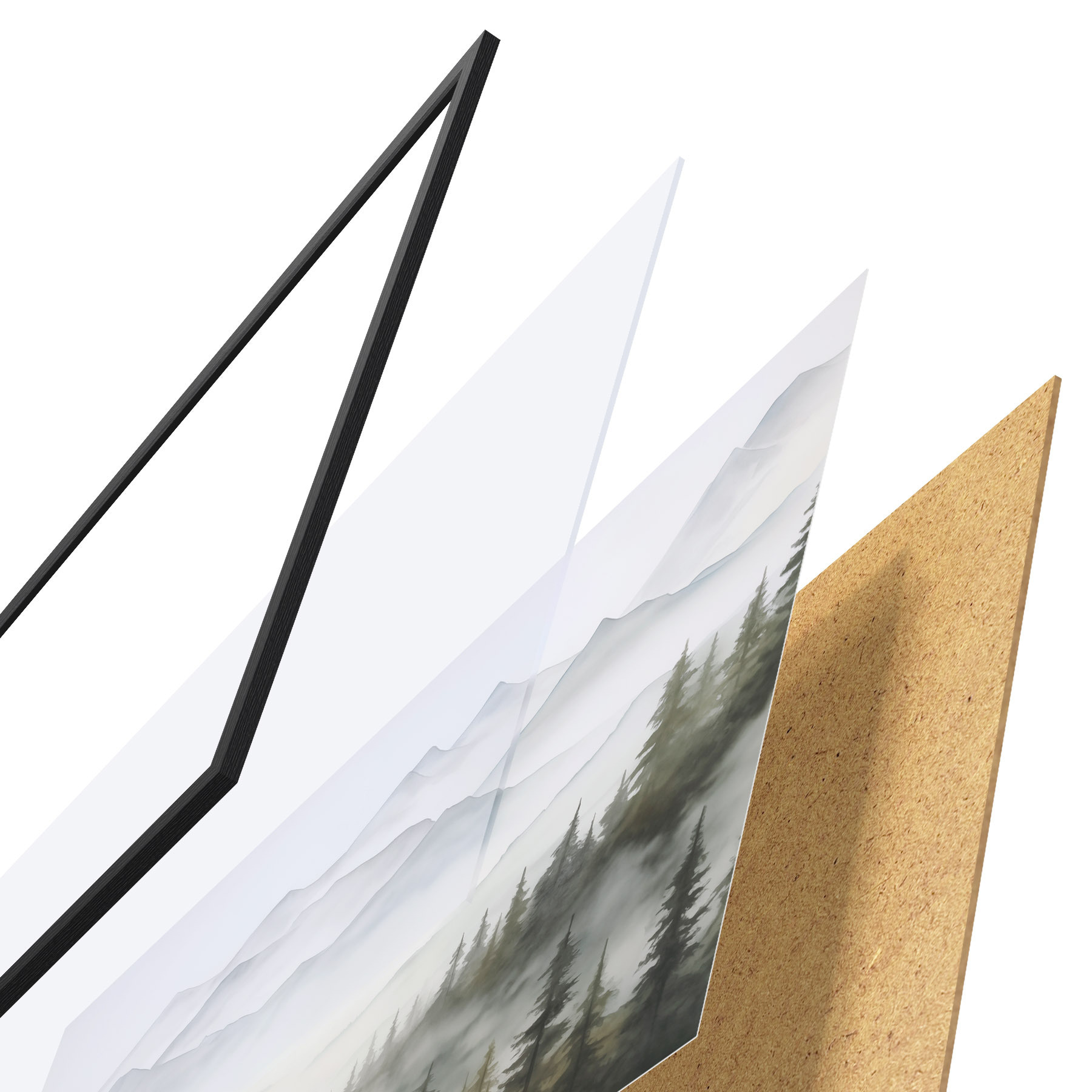 El póster consta de marco, plexiglás, imagen impresa y soporte de aglomerado. El póster puede colgarse inmediatamente en la pared gracias a los soportes de la parte posterior.