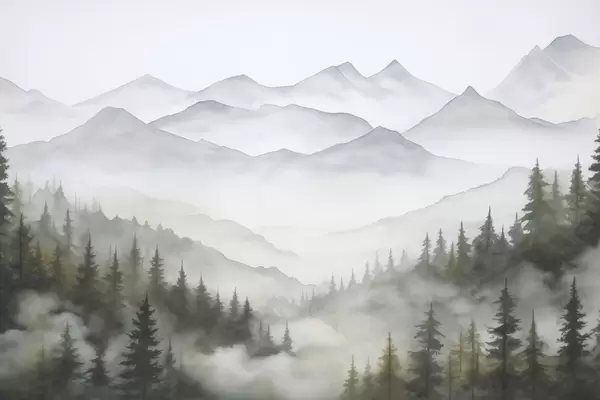 Poster Bosque en la niebla frente a las montañas Nr f45774