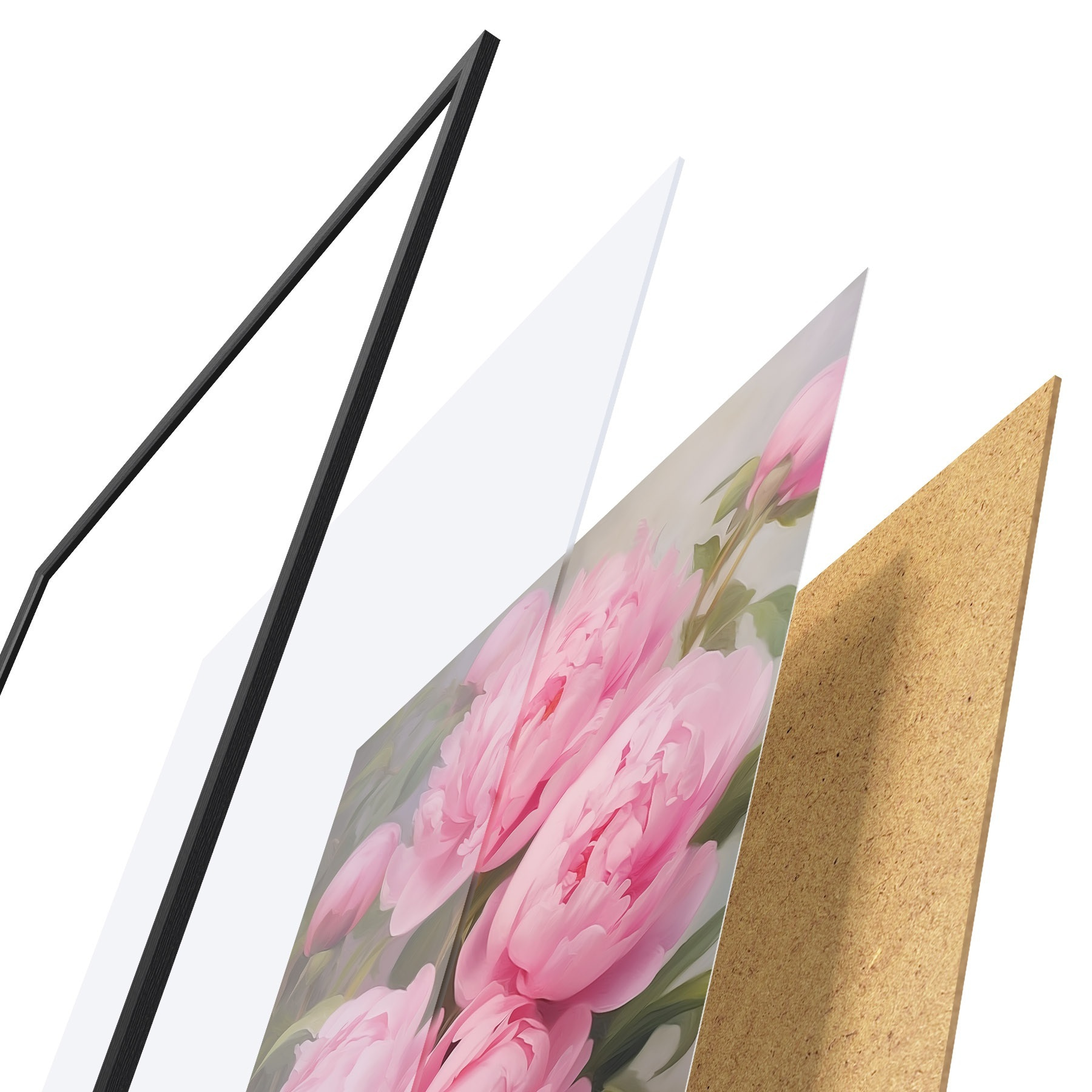 El póster consta de marco, plexiglás, imagen impresa y soporte de aglomerado. El póster puede colgarse inmediatamente en la pared gracias a los soportes de la parte posterior.