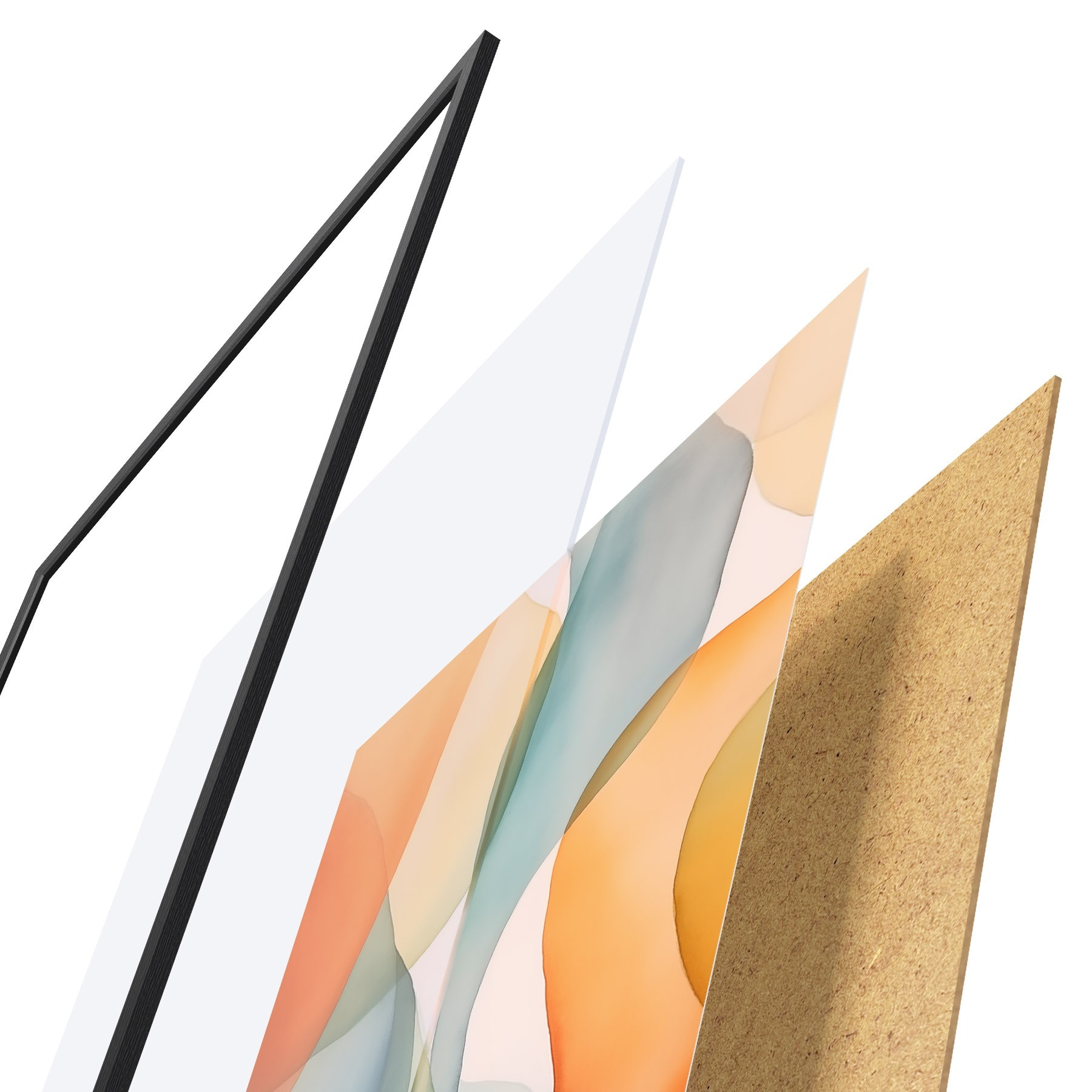 El póster consta de marco, plexiglás, imagen impresa y soporte de aglomerado. El póster puede colgarse inmediatamente en la pared gracias a los soportes de la parte posterior.