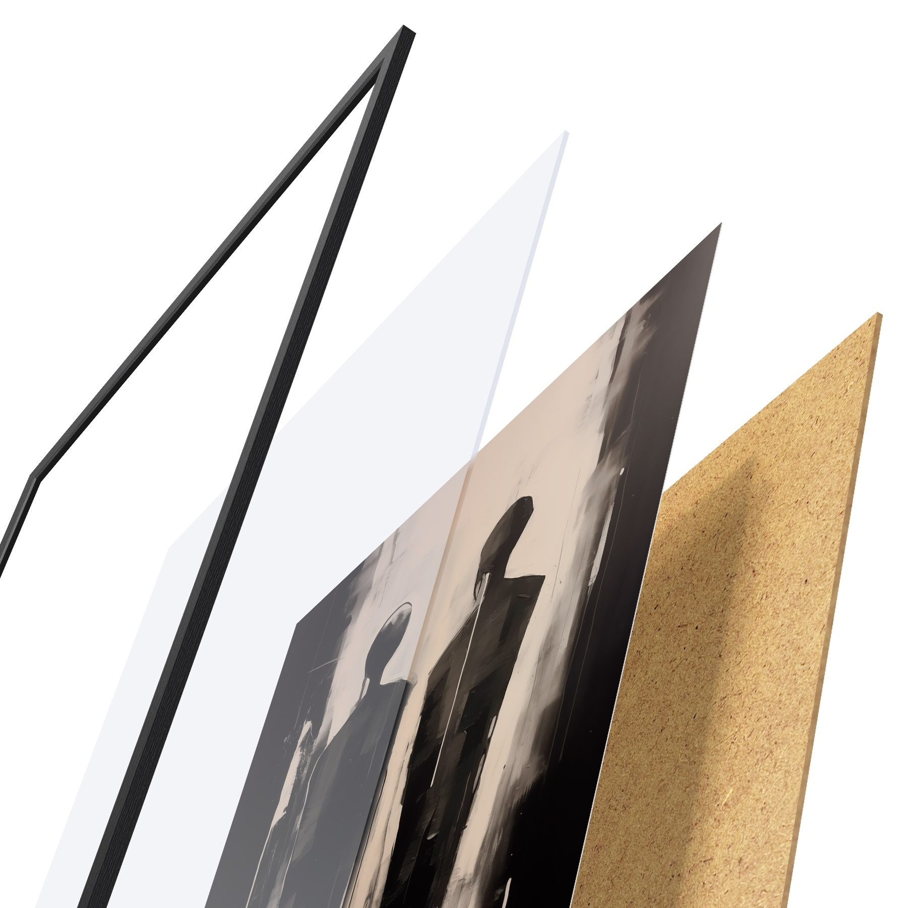 El póster consta de marco, plexiglás, imagen impresa y soporte de aglomerado. El póster puede colgarse inmediatamente en la pared gracias a los soportes de la parte posterior.