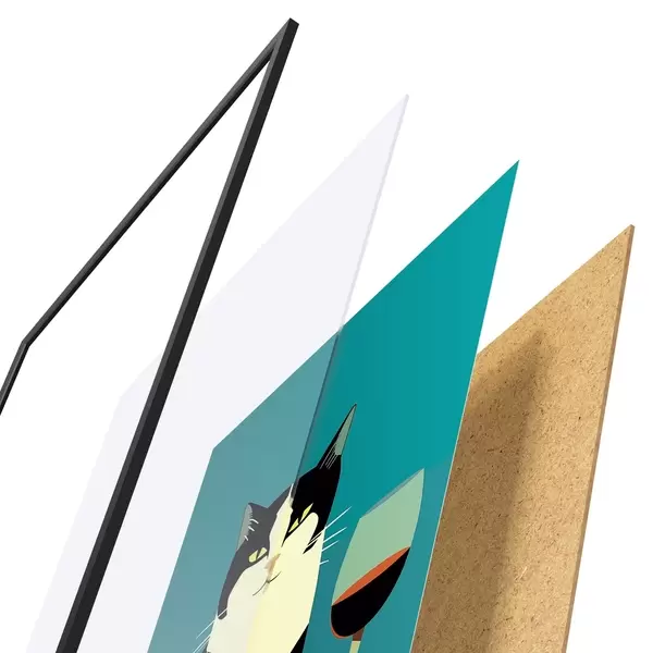 El póster consta de marco, plexiglás, imagen impresa y soporte de aglomerado. El póster puede colgarse inmediatamente en la pared gracias a los soportes de la parte posterior.