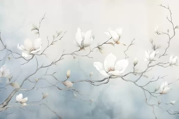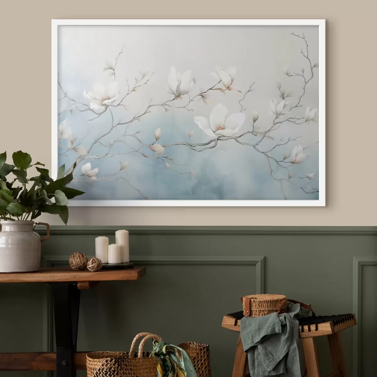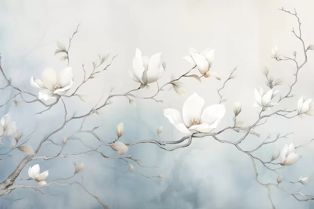 Poster Ramas de magnolia con flores blancas sobre un delicado fondo f45806