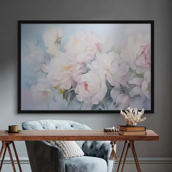Poster Delicadas peonías rosas sobre un fondo azul cielo f45813