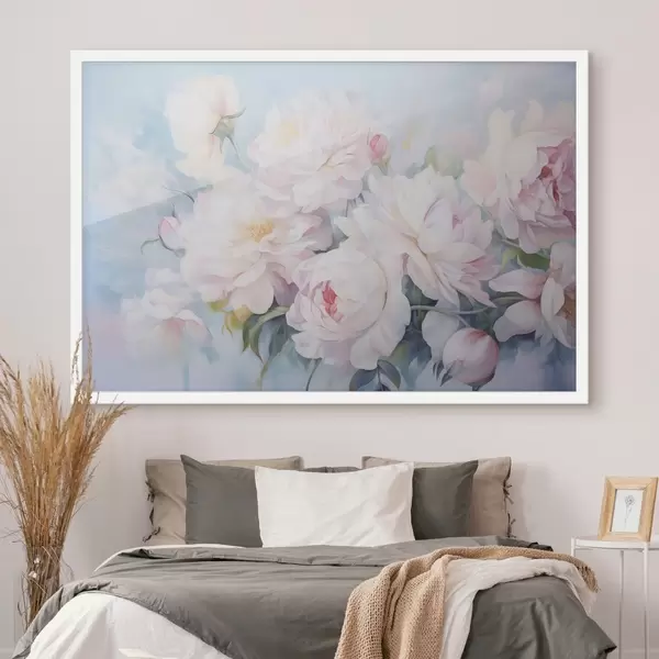 Poster Delicadas peonías rosas sobre un fondo azul cielo f45813