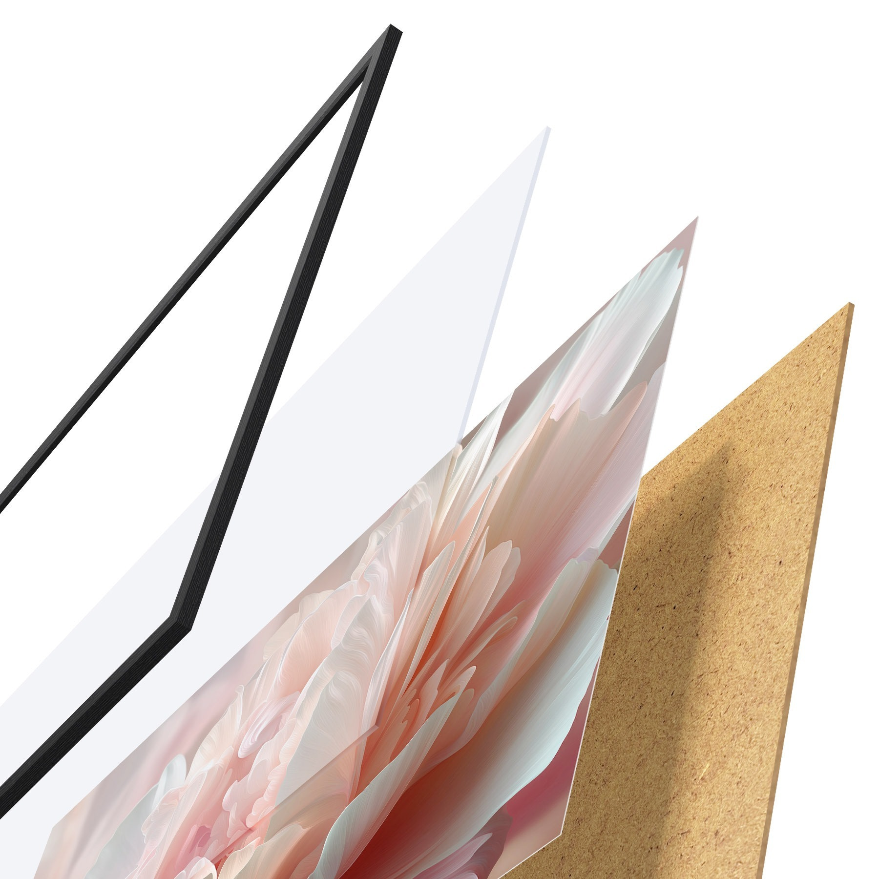El póster consta de marco, plexiglás, imagen impresa y soporte de aglomerado. El póster puede colgarse inmediatamente en la pared gracias a los soportes de la parte posterior.