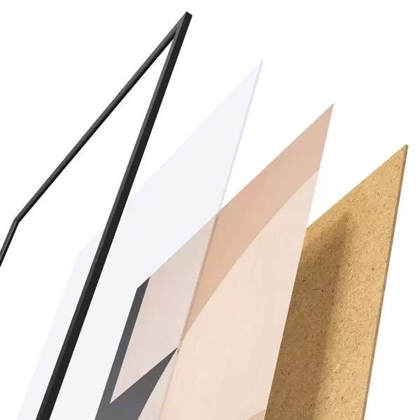 El póster consta de marco, plexiglás, imagen impresa y soporte de aglomerado. El póster puede colgarse inmediatamente en la pared gracias a los soportes de la parte posterior.