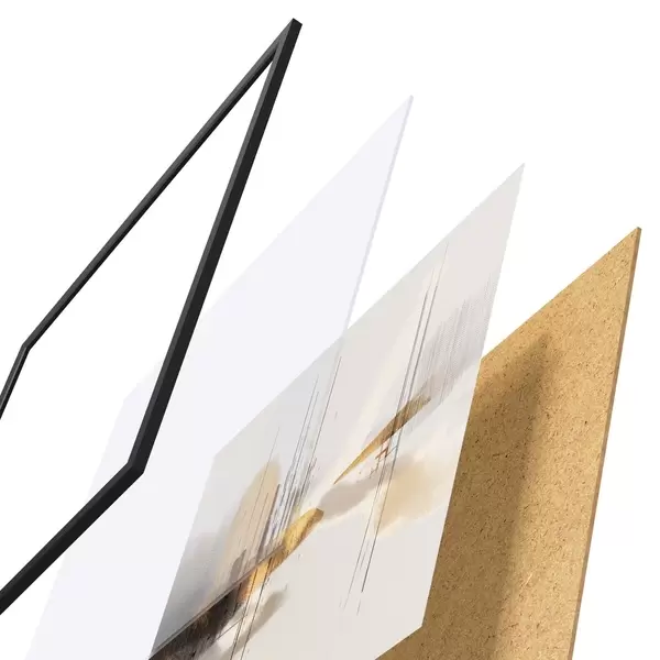 El póster consta de marco, plexiglás, imagen impresa y soporte de aglomerado. El póster puede colgarse inmediatamente en la pared gracias a los soportes de la parte posterior.