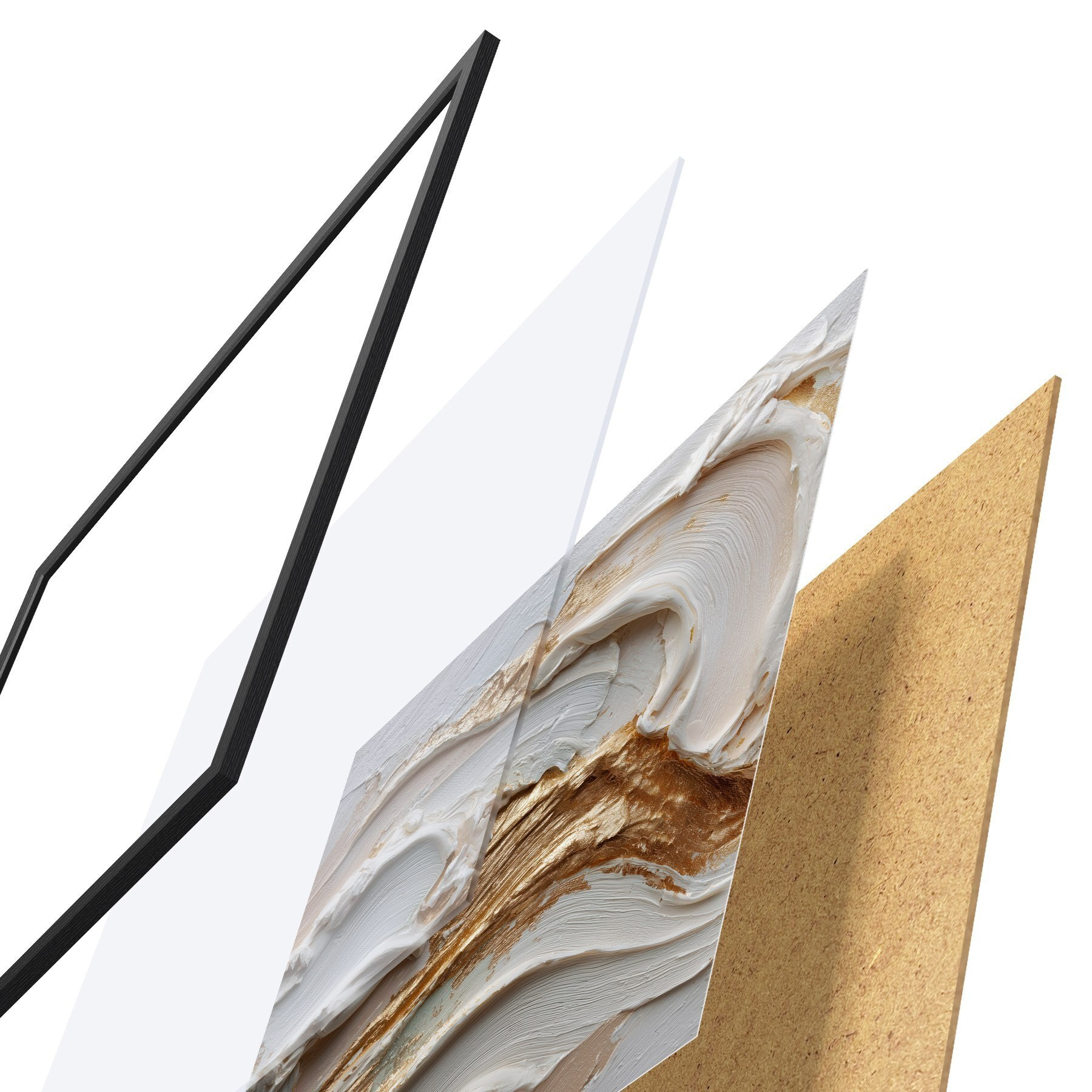 El póster consta de marco, plexiglás, imagen impresa y soporte de aglomerado. El póster puede colgarse inmediatamente en la pared gracias a los soportes de la parte posterior.