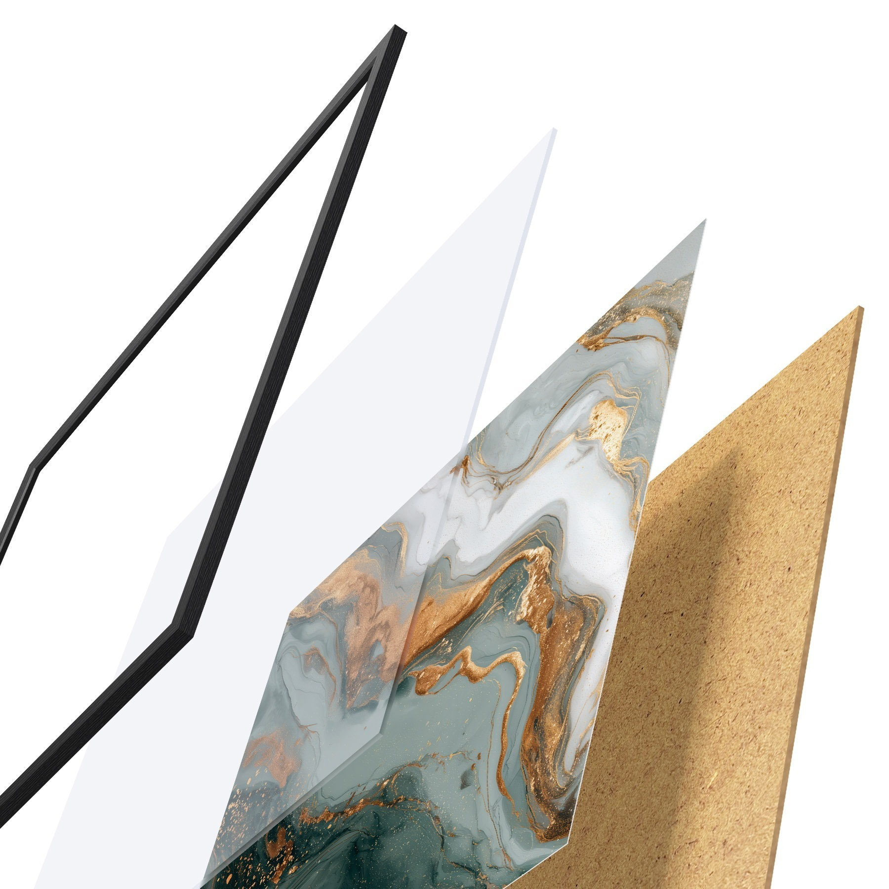 El póster consta de marco, plexiglás, imagen impresa y soporte de aglomerado. El póster puede colgarse inmediatamente en la pared gracias a los soportes de la parte posterior.