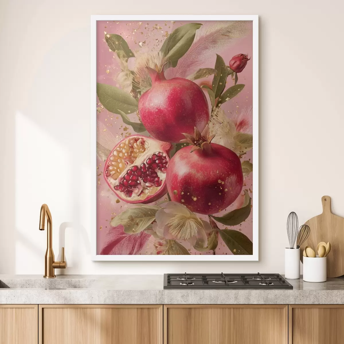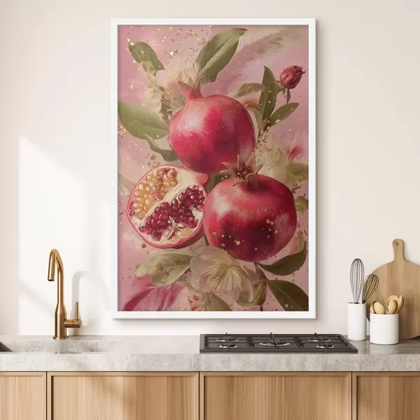 Poster Granadas maduras sobre fondo rosa con follaje y motas doradas Nr f45868