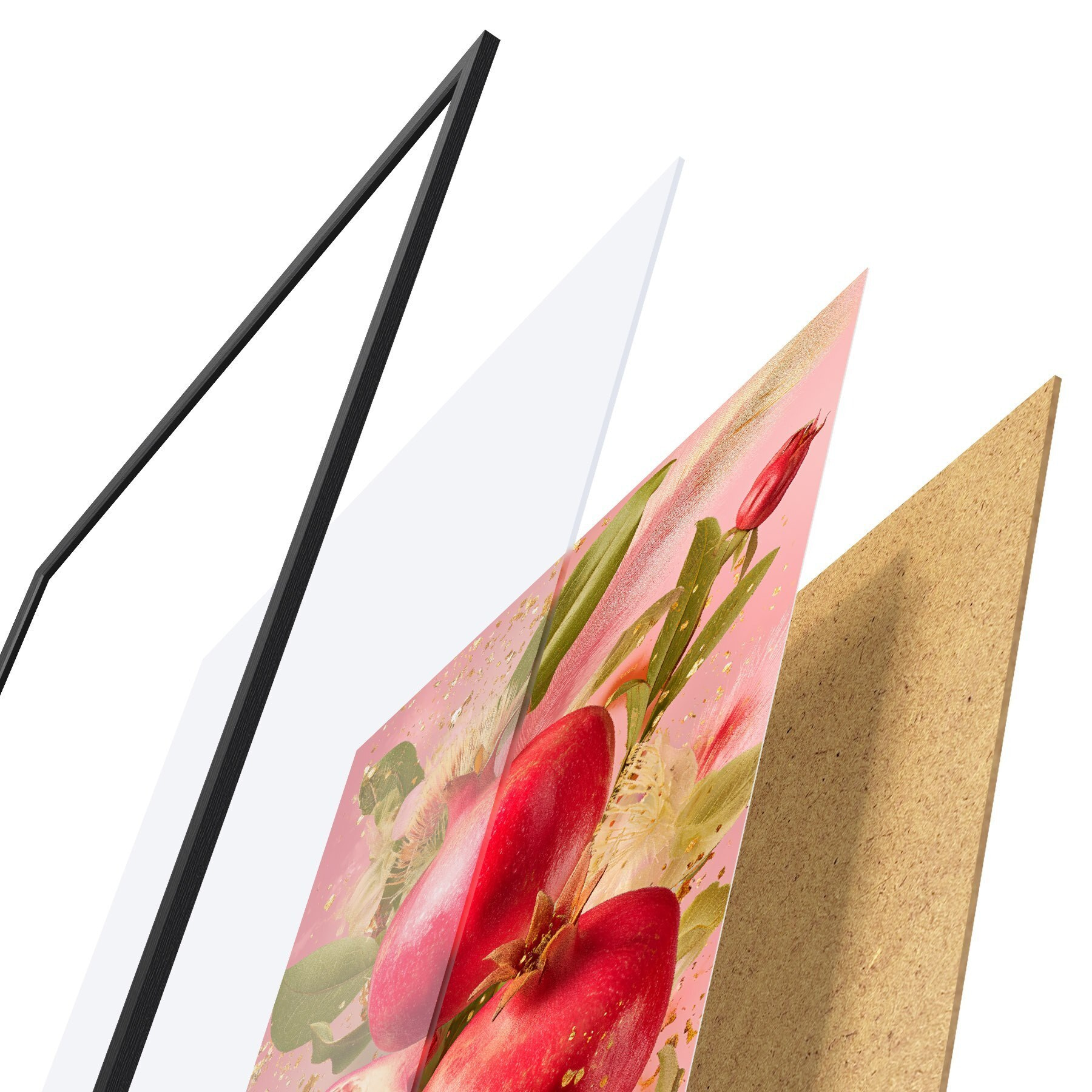 El póster consta de marco, plexiglás, imagen impresa y soporte de aglomerado. El póster puede colgarse inmediatamente en la pared gracias a los soportes de la parte posterior.