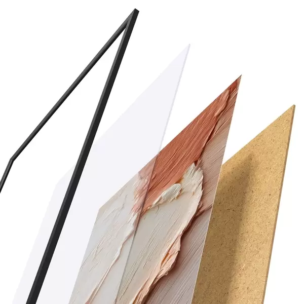 El póster consta de marco, plexiglás, imagen impresa y soporte de aglomerado. El póster puede colgarse inmediatamente en la pared gracias a los soportes de la parte posterior.