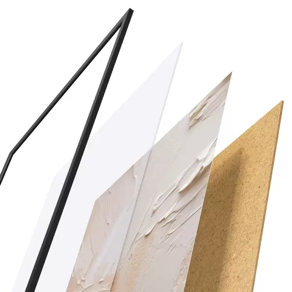 El póster consta de marco, plexiglás, imagen impresa y soporte de aglomerado. El póster puede colgarse inmediatamente en la pared gracias a los soportes de la parte posterior.