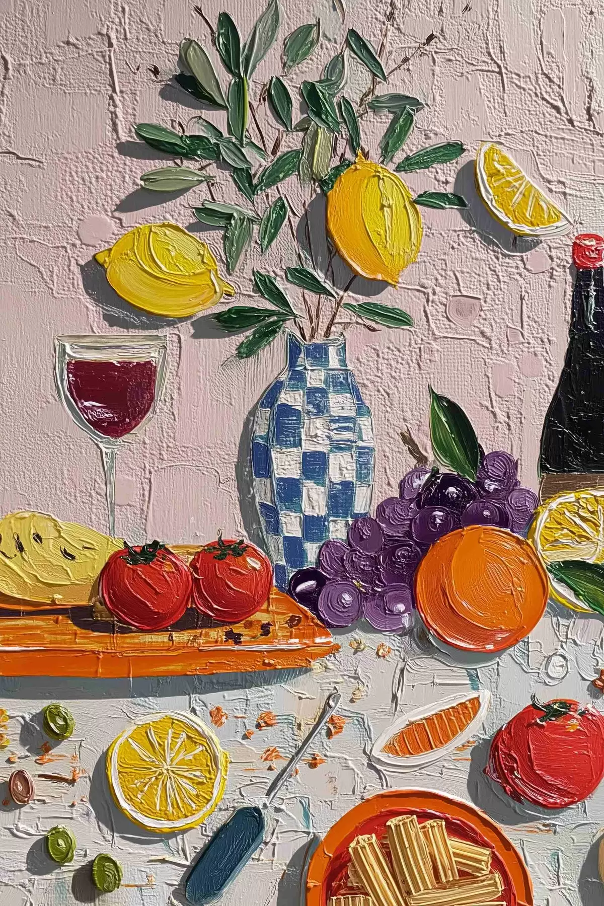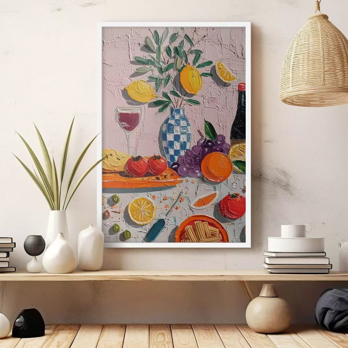 Poster Naturaleza muerta en tonos pastel: limones, uvas y tomates, impasto Nr f45876