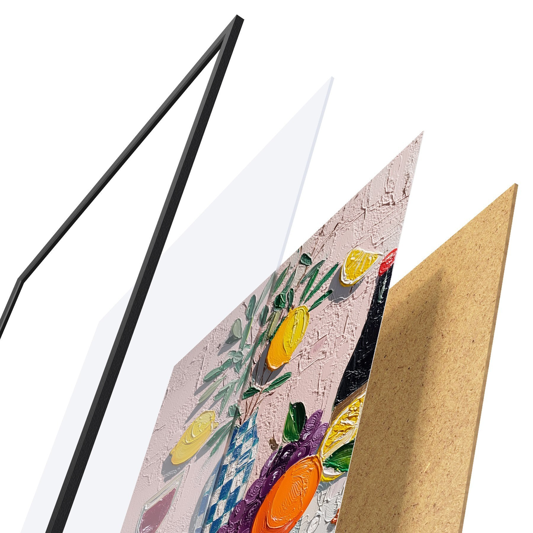 El póster consta de marco, plexiglás, imagen impresa y soporte de aglomerado. El póster puede colgarse inmediatamente en la pared gracias a los soportes de la parte posterior.