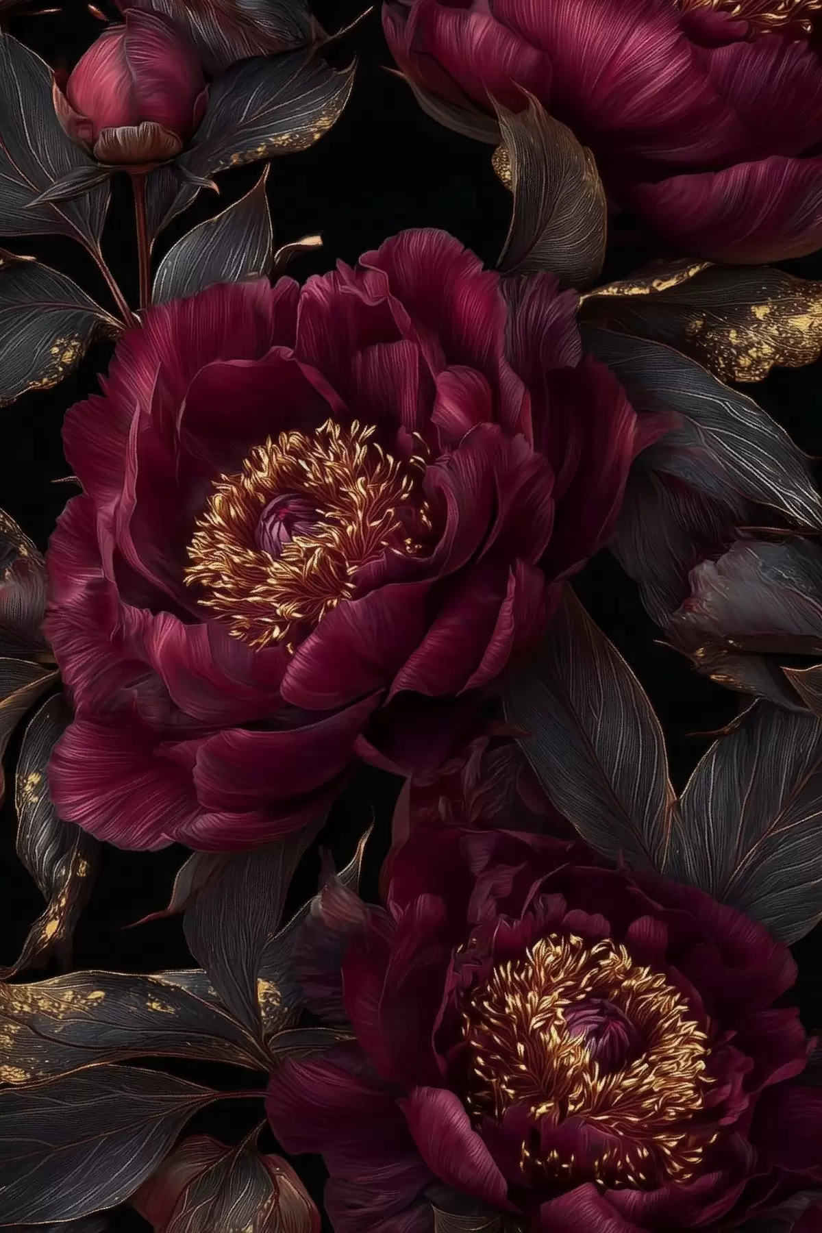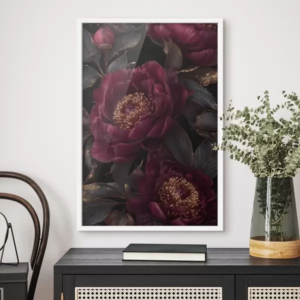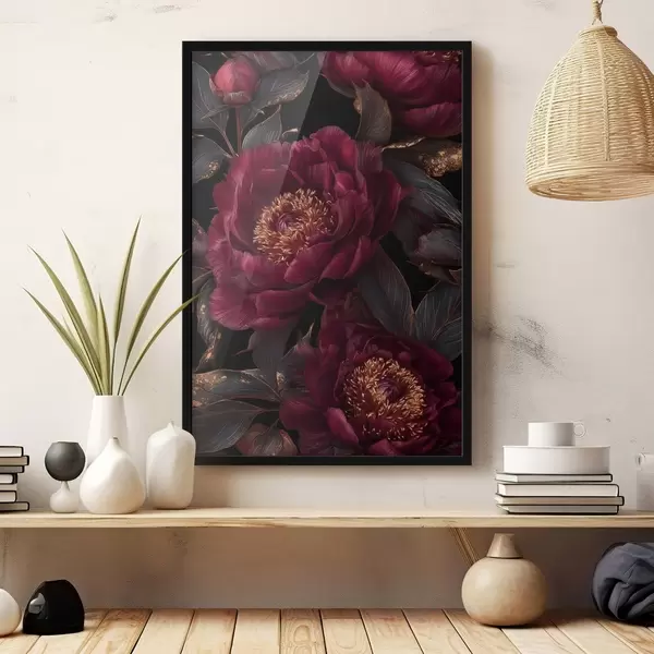 Poster Peonías burdeos sobre fondo negro con detalles en amarillo Nr f45877