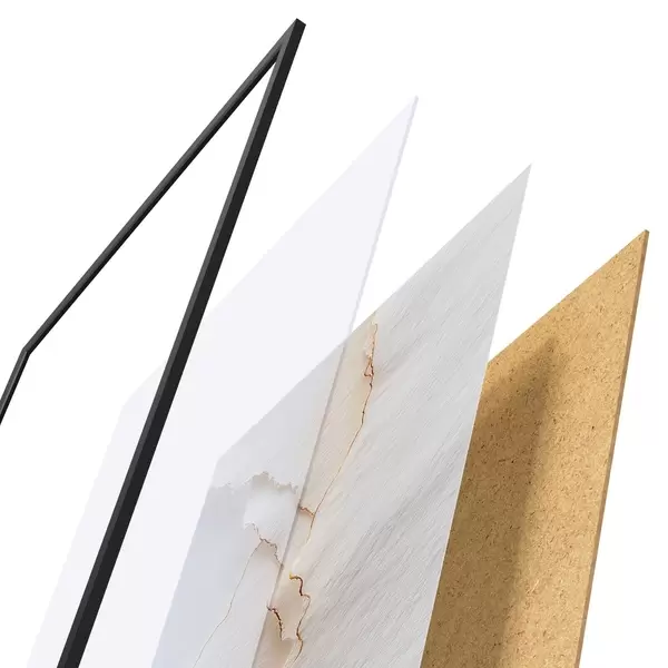 El póster consta de marco, plexiglás, imagen impresa y soporte de aglomerado. El póster puede colgarse inmediatamente en la pared gracias a los soportes de la parte posterior.