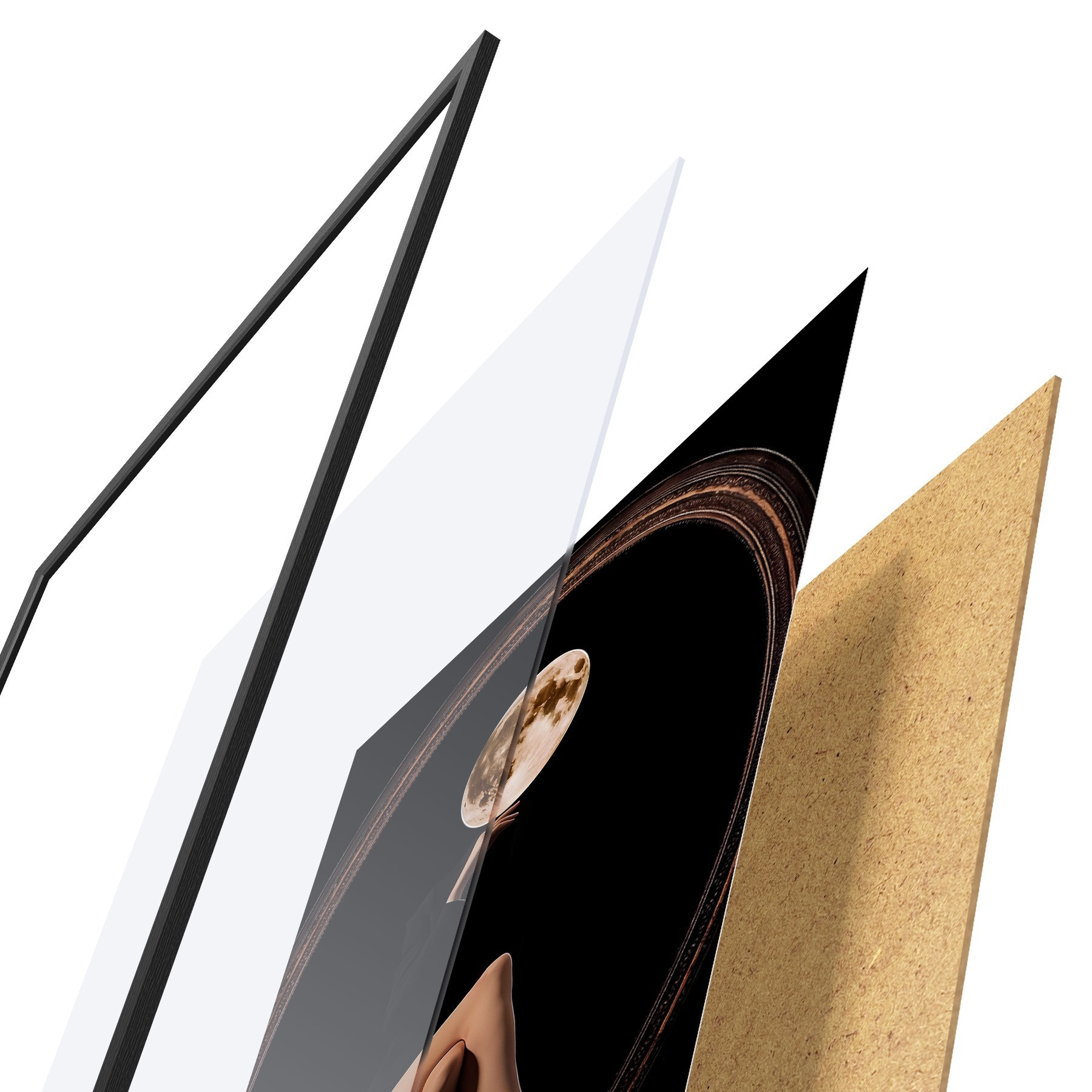 El póster consta de marco, plexiglás, imagen impresa y soporte de aglomerado. El póster puede colgarse inmediatamente en la pared gracias a los soportes de la parte posterior.