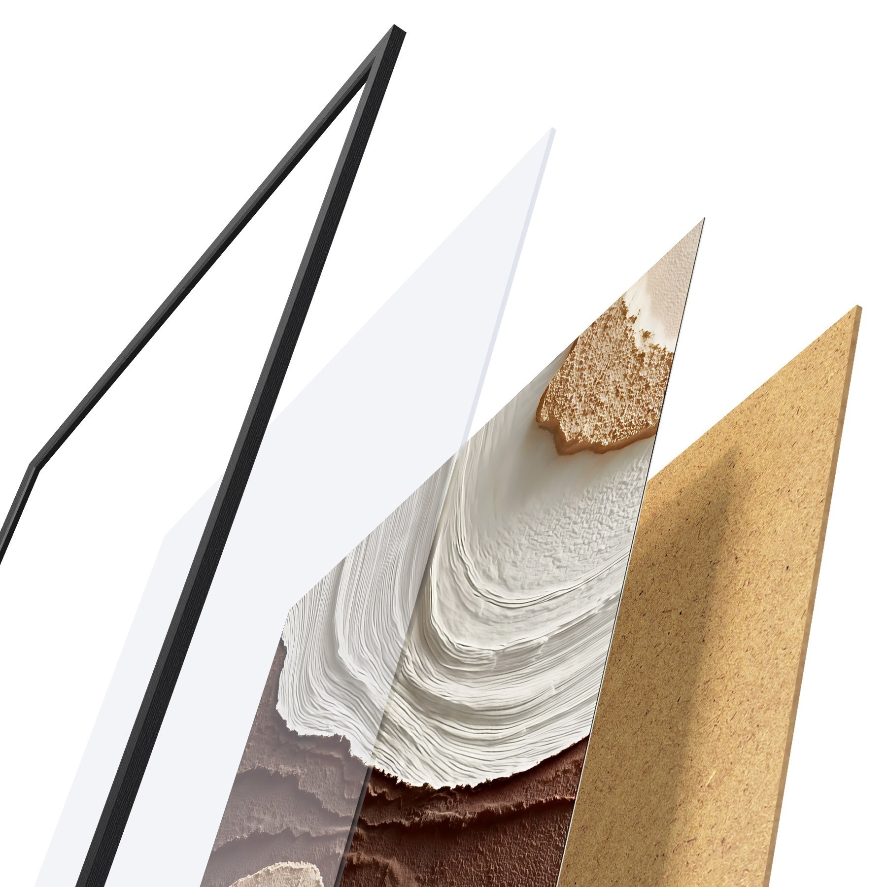 El póster consta de marco, plexiglás, imagen impresa y soporte de aglomerado. El póster puede colgarse inmediatamente en la pared gracias a los soportes de la parte posterior.
