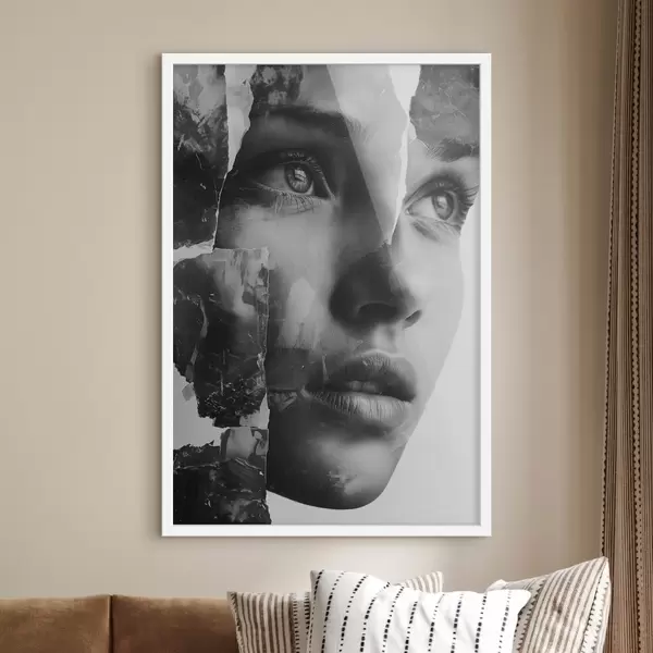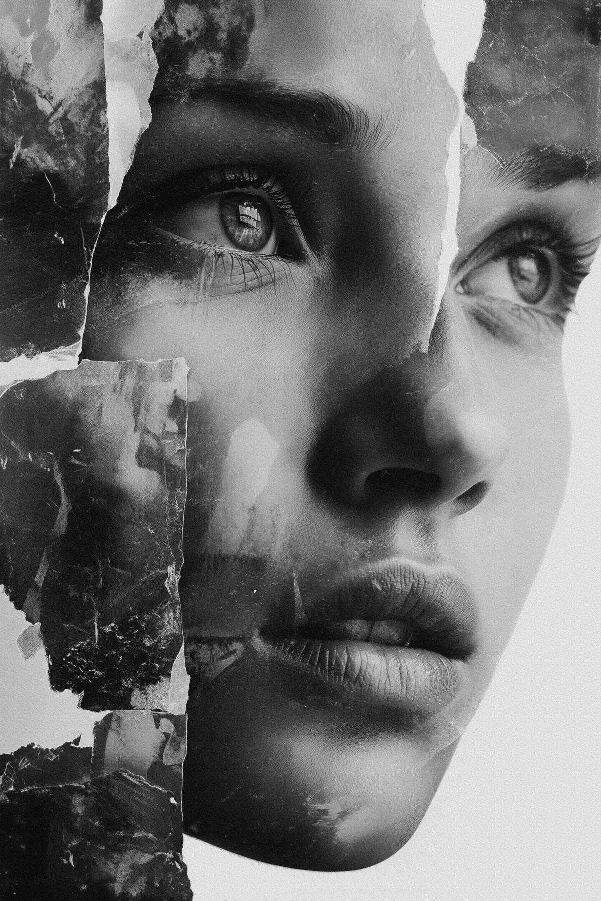 Poster Retrato collage en blanco y negro con capas rasgadas con textura f45898