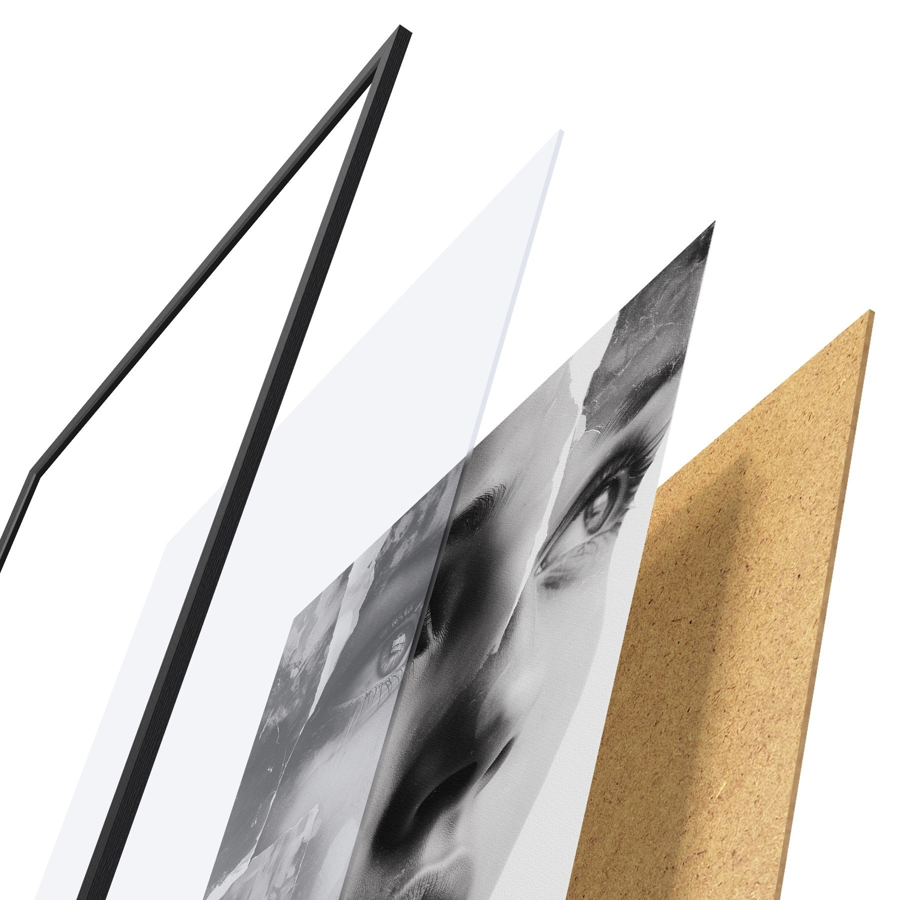 El póster consta de marco, plexiglás, imagen impresa y soporte de aglomerado. El póster puede colgarse inmediatamente en la pared gracias a los soportes de la parte posterior.