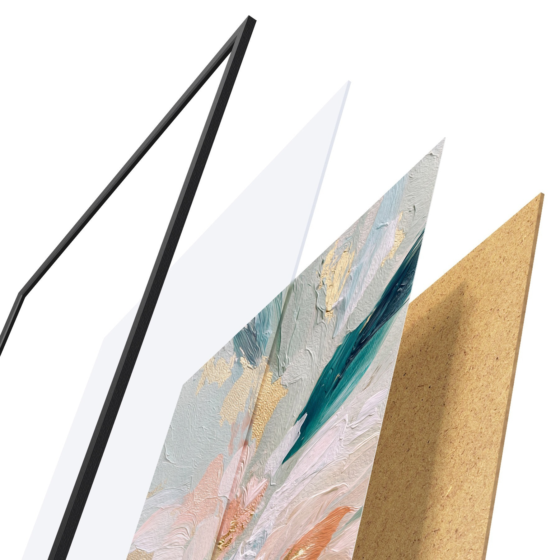 El póster consta de marco, plexiglás, imagen impresa y soporte de aglomerado. El póster puede colgarse inmediatamente en la pared gracias a los soportes de la parte posterior.