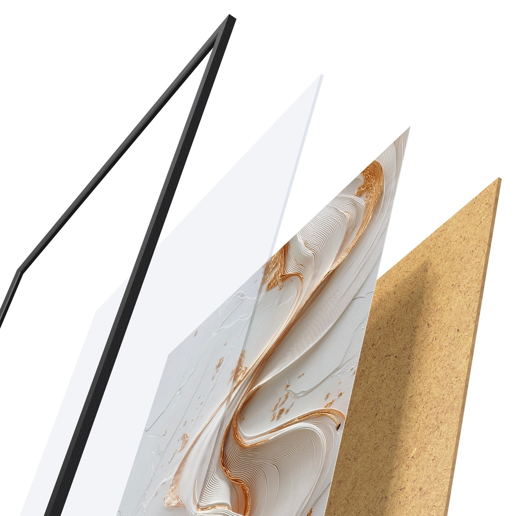 El póster consta de marco, plexiglás, imagen impresa y soporte de aglomerado. El póster puede colgarse inmediatamente en la pared gracias a los soportes de la parte posterior.