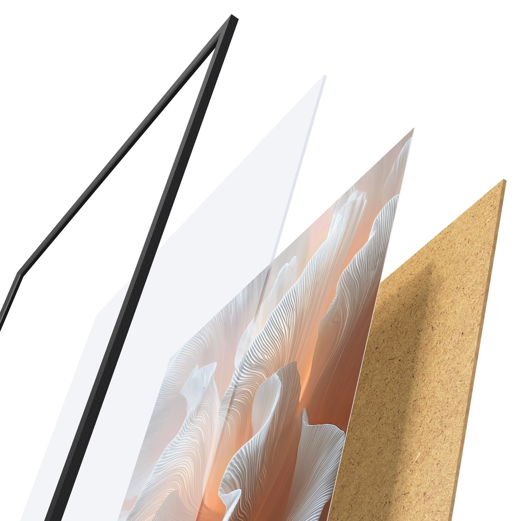 El póster consta de marco, plexiglás, imagen impresa y soporte de aglomerado. El póster puede colgarse inmediatamente en la pared gracias a los soportes de la parte posterior.