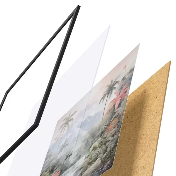 El póster consta de marco, plexiglás, imagen impresa y soporte de aglomerado. El póster puede colgarse inmediatamente en la pared gracias a los soportes de la parte posterior.