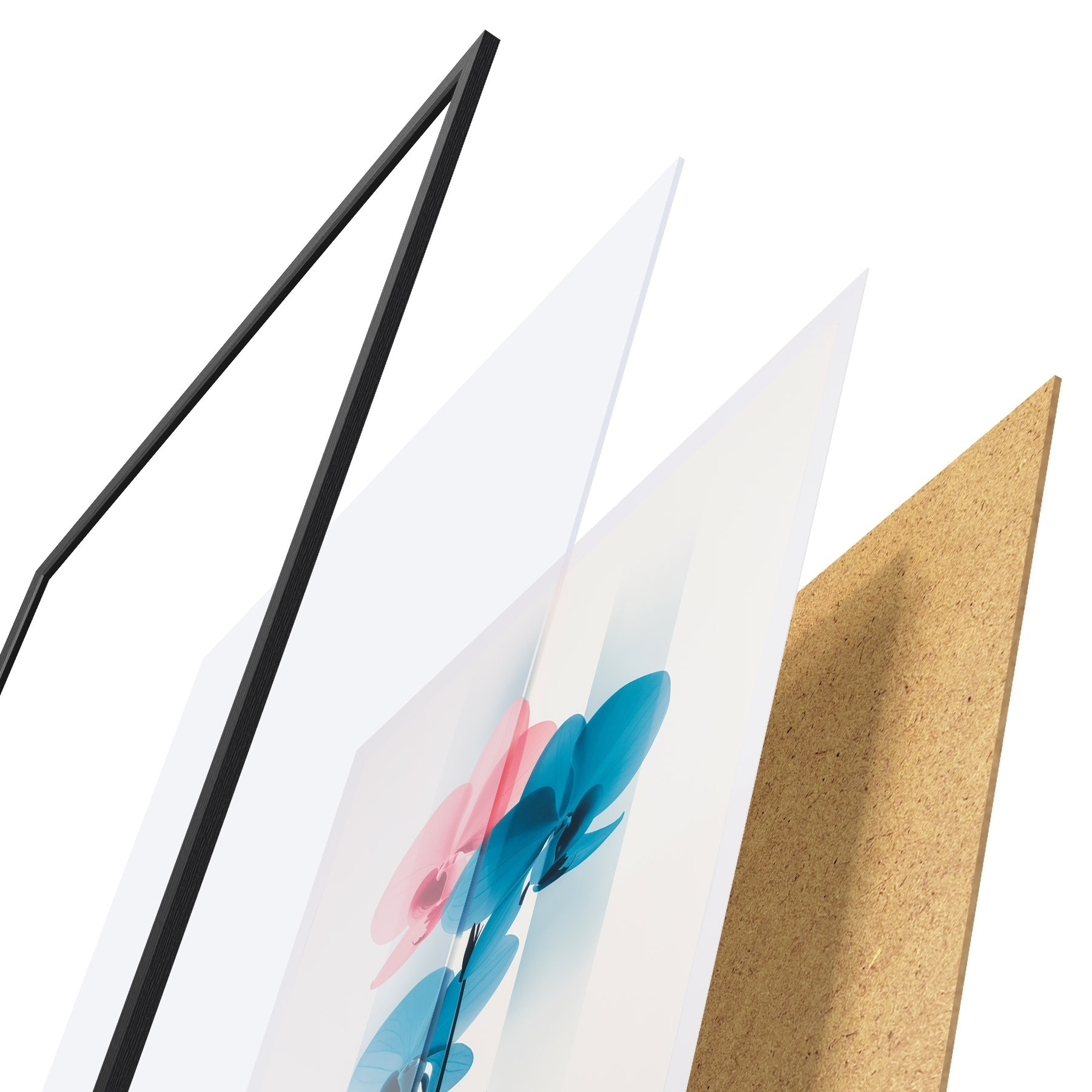 El póster consta de marco, plexiglás, imagen impresa y soporte de aglomerado. El póster puede colgarse inmediatamente en la pared gracias a los soportes de la parte posterior.