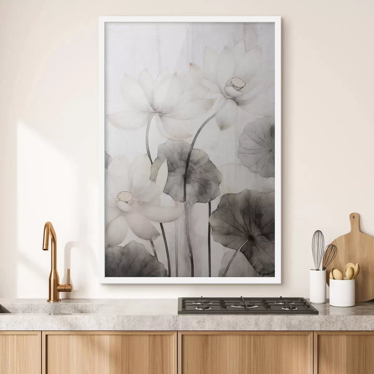 Poster Flores de loto blancas con textura y hojas oscuras, fondo claro, diseño minimalista Nr f45937