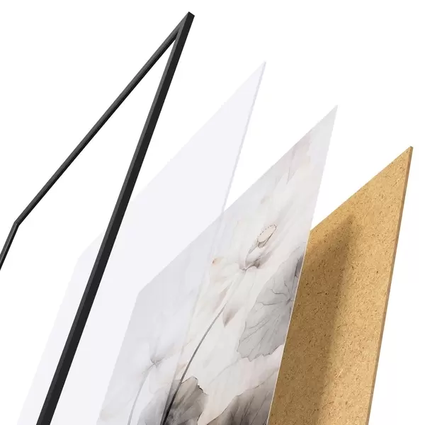 El póster consta de marco, plexiglás, imagen impresa y soporte de aglomerado. El póster puede colgarse inmediatamente en la pared gracias a los soportes de la parte posterior.
