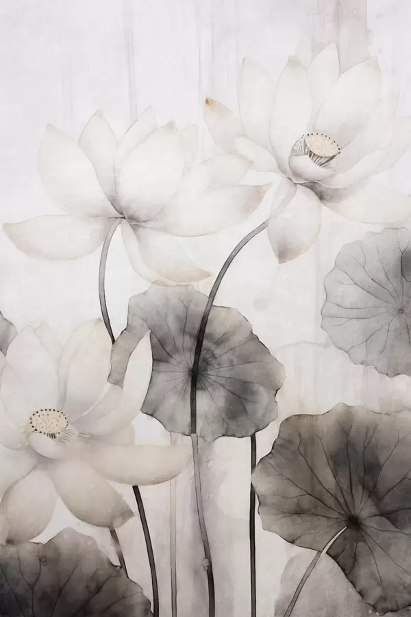 Poster Flores de loto blancas con textura y hojas oscuras, fondo claro, diseño minimalista Nr f45937