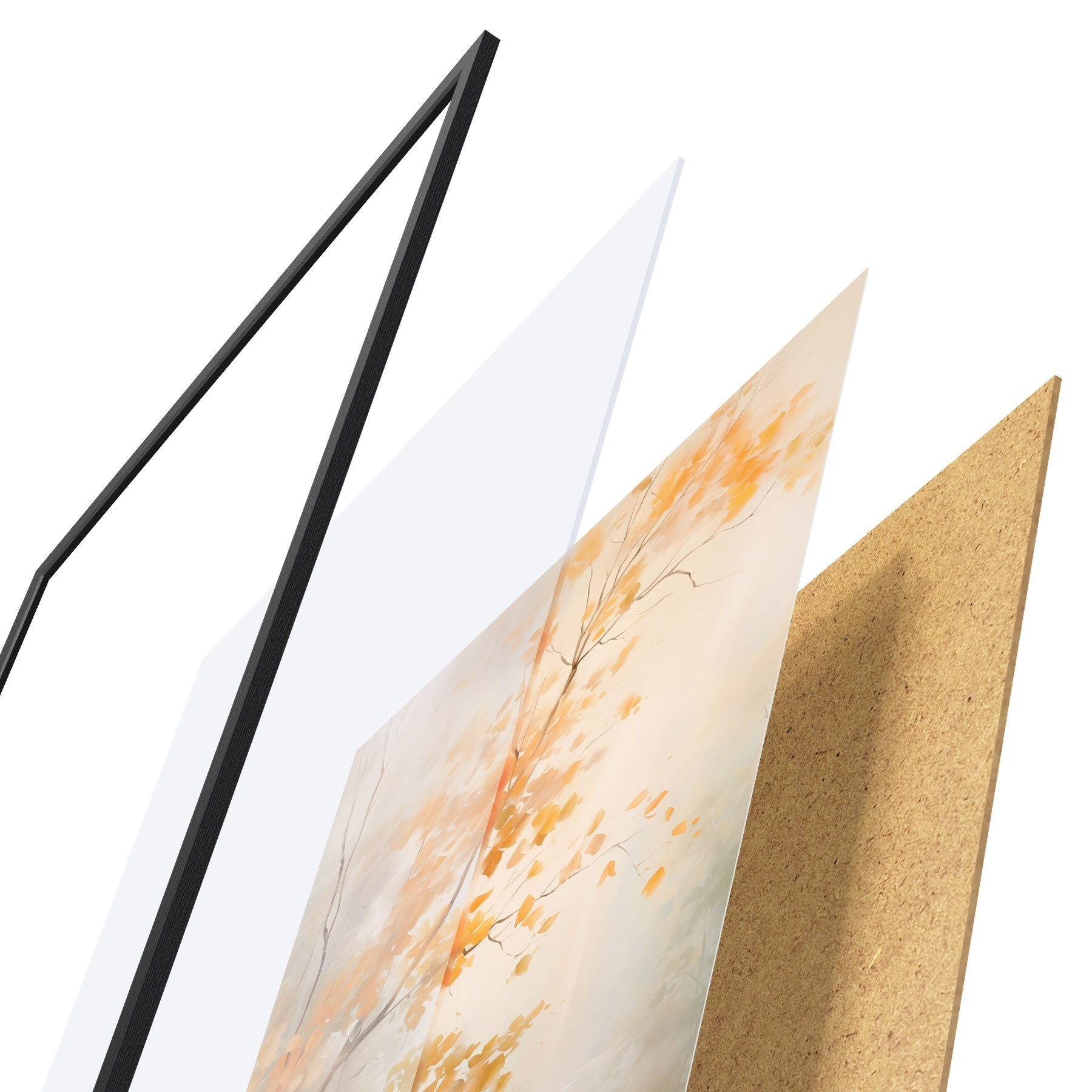 El póster consta de marco, plexiglás, imagen impresa y soporte de aglomerado. El póster puede colgarse inmediatamente en la pared gracias a los soportes de la parte posterior.