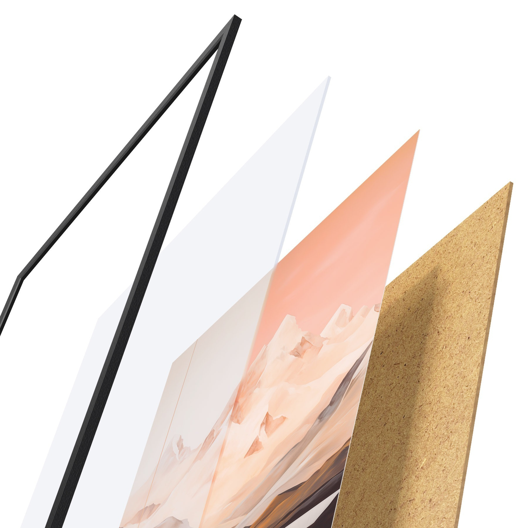 El póster consta de marco, plexiglás, imagen impresa y soporte de aglomerado. El póster puede colgarse inmediatamente en la pared gracias a los soportes de la parte posterior.
