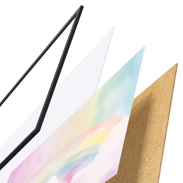 El póster consta de marco, plexiglás, imagen impresa y soporte de aglomerado. El póster puede colgarse inmediatamente en la pared gracias a los soportes de la parte posterior.