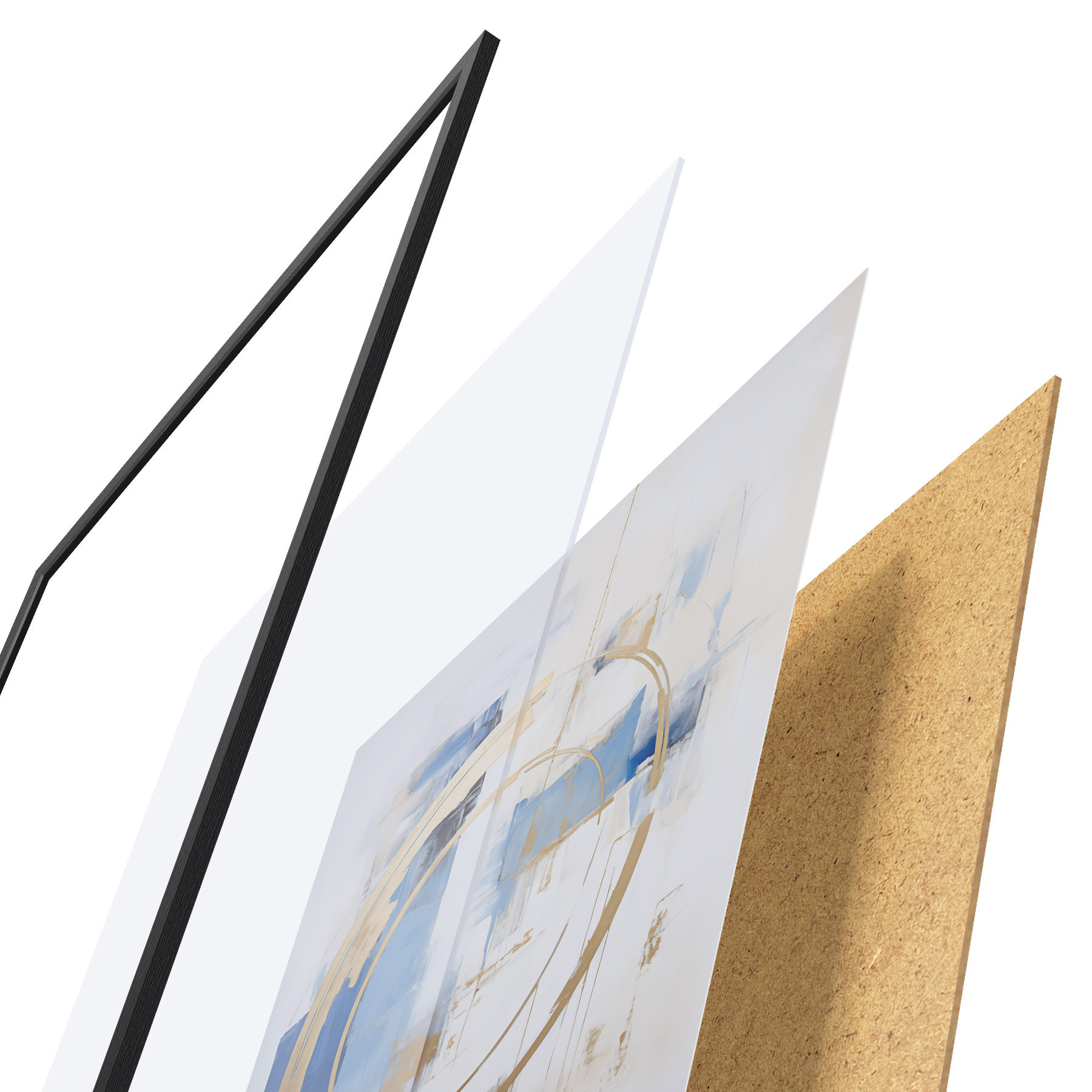 El póster consta de marco, plexiglás, imagen impresa y soporte de aglomerado. El póster puede colgarse inmediatamente en la pared gracias a los soportes de la parte posterior.