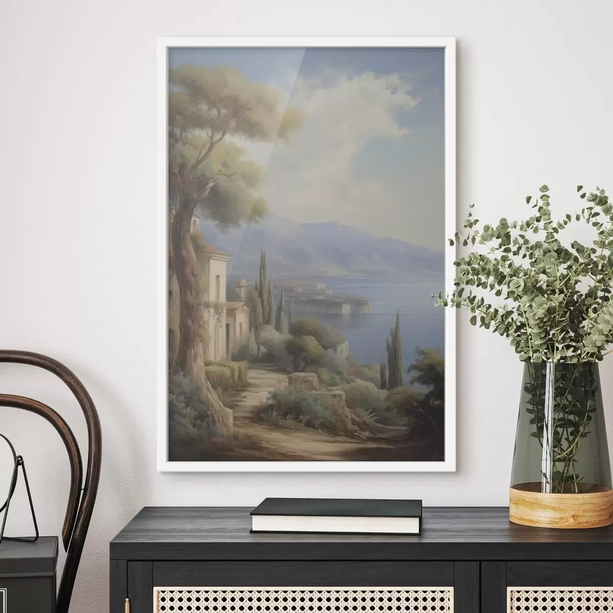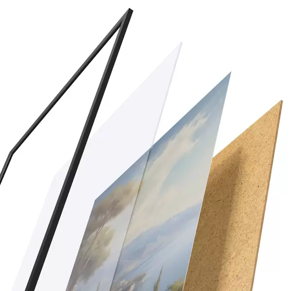 El póster consta de marco, plexiglás, imagen impresa y soporte de aglomerado. El póster puede colgarse inmediatamente en la pared gracias a los soportes de la parte posterior.