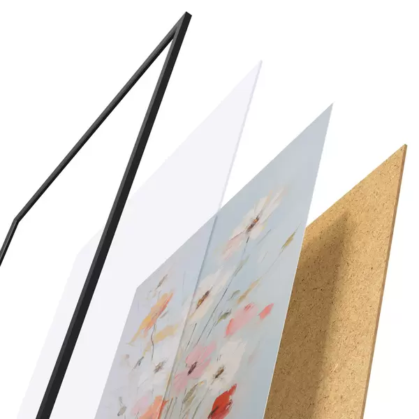 El póster consta de marco, plexiglás, imagen impresa y soporte de aglomerado. El póster puede colgarse inmediatamente en la pared gracias a los soportes de la parte posterior.