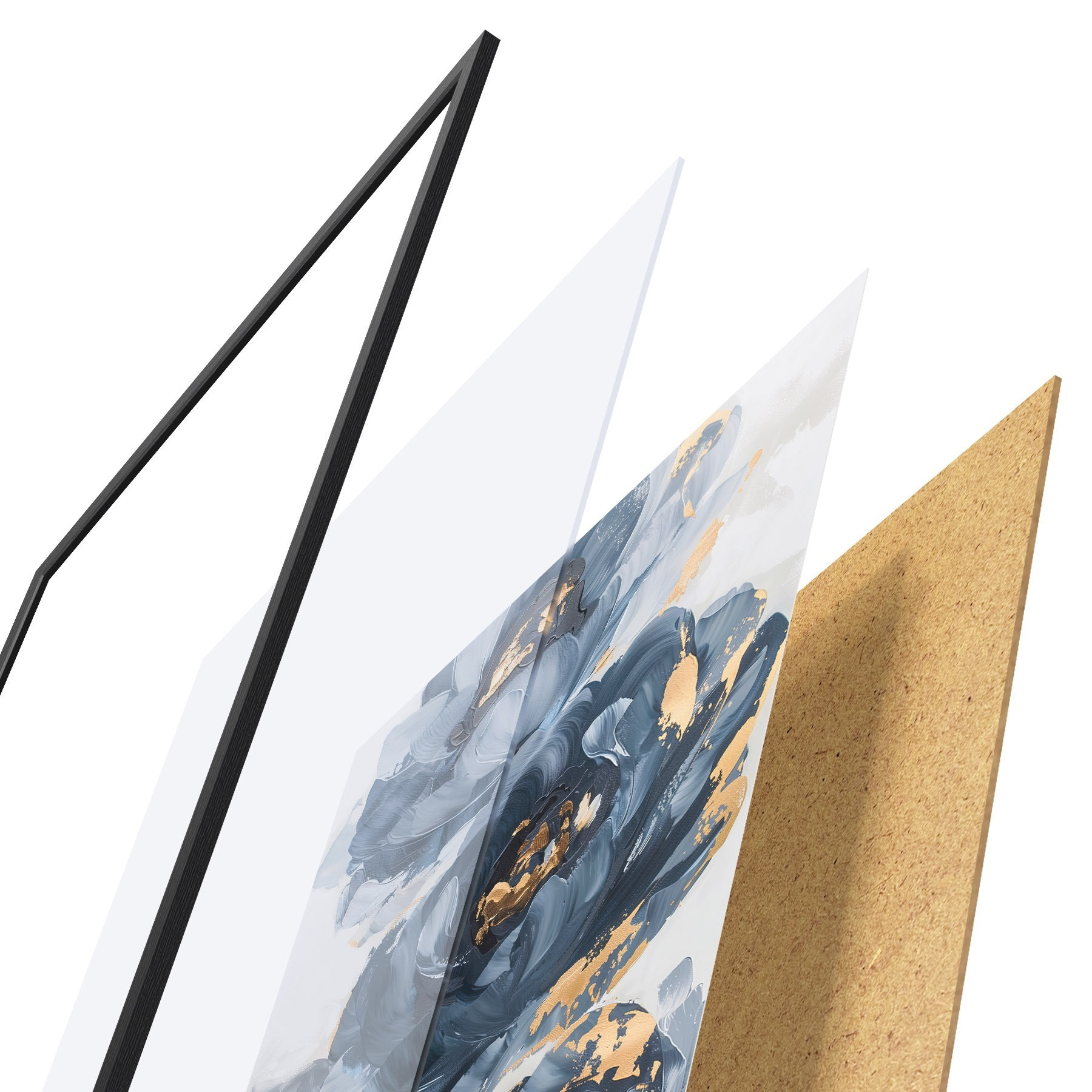 El póster consta de marco, plexiglás, imagen impresa y soporte de aglomerado. El póster puede colgarse inmediatamente en la pared gracias a los soportes de la parte posterior.